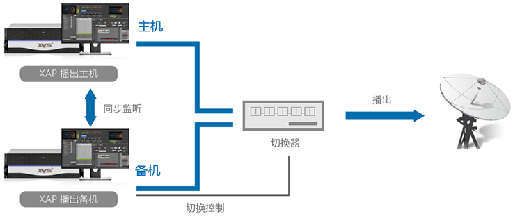 XUAP还有备机播出的功能提供选择,可让您的频道安全机制更添加 层保障。在这环境下,备机会不断监听主机的状态,并随时保持与主机同步影像,当主机讯号发生问题,会立即连动 Switcher,将频道讯号切换到备机。