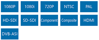XUAP 系列依型号可支持 1080P、1080i、720P、NTSC、PAL 等 HD 与 SD 规格,视讯输出讯号提供 HD/SD-SDI、HDMI、Component、Composite 等规格,音频除了 SDI 与 HDMI 内嵌的声音外,更提供 AES/EBU、XLR 等规格。