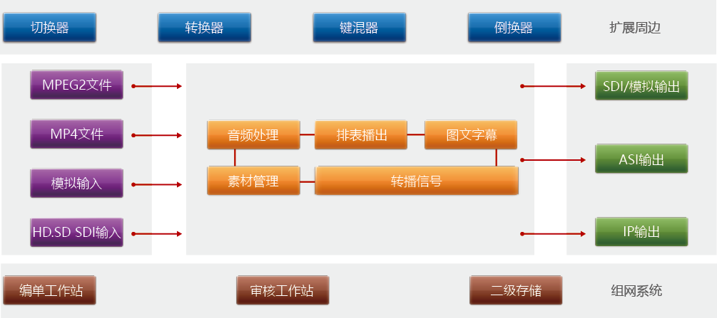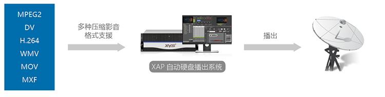 XUAP系统采用 进硬件译码技术的自动播出系统,可依设定时间自动化切换影片与触发连动外围设备,如 矩阵、录像机、切换器 等,大幅节省影片连续播放所需金钱与人力成本。XUAP 系列具有「多格式处理引擎」,可以稳定支持 MPEG2、DV、MXF、SD 与HD 等各种影像格式来源;让各种不同的形式的档案安排于同 个节目排序表当中,进行完美无接缝排序播出。纵使在 On-Air 在线播出状态下,仍然可以更动播出表次序。 XUAP 系列不同型号,具备不同输出或外围支持规格,XUAP 可具备 SDI、HDMI、Component、Composite、Embedded Audio、AES/EBU、XLR 等输出,加上操作简单容易,易于与素材管理系统结合的特性。是 套完美的自动化广播 播出系统(Playout Server)。