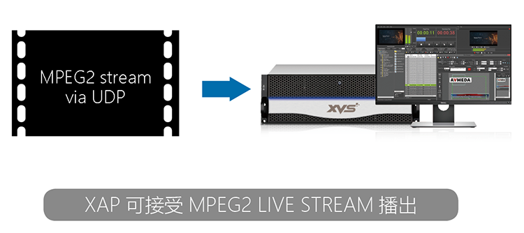 由卫星或网络等多样媒介所传输的MPEG2 Transport stream是常需要介接的影音来源,XUAP系统可透过UDP的通讯协议,可将MPEG2的串流档案,设定为影音来源,直接完整支持,无需外购转换设备。