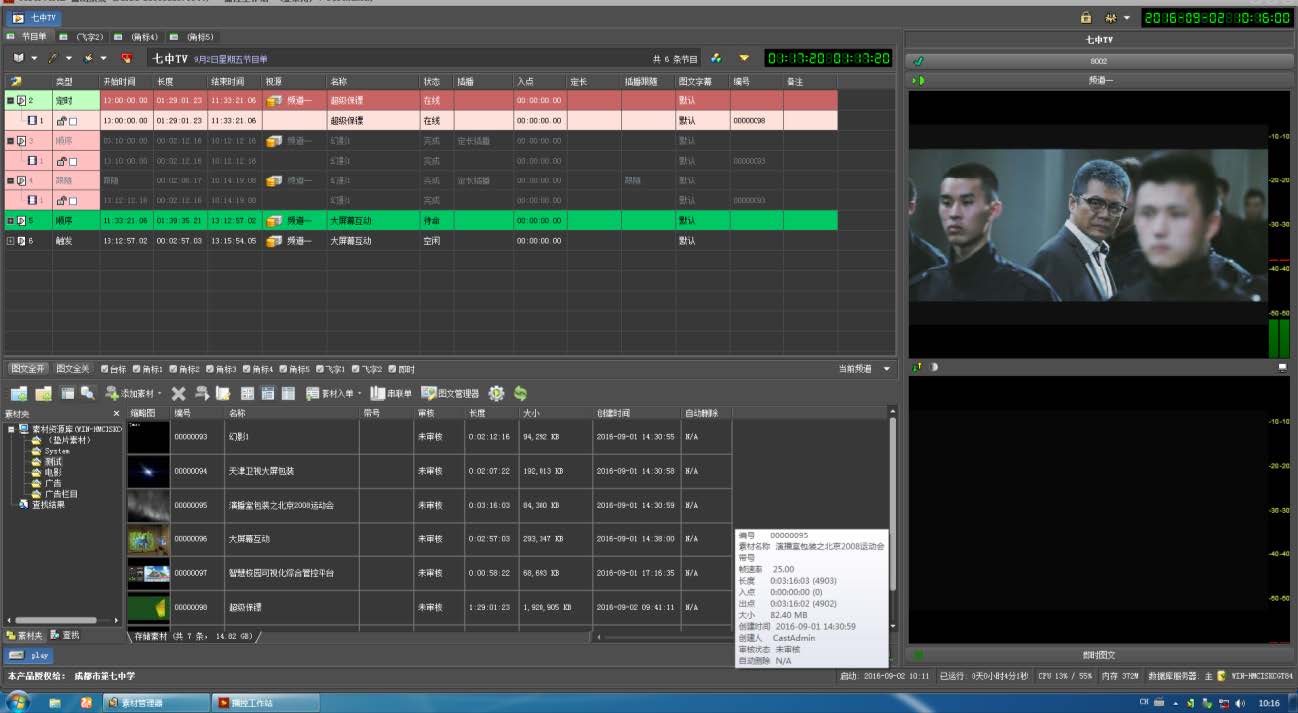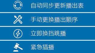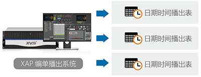 可编辑日期播出表(年、月、日、时、分、秒),会自动依据编辑的播出表加载播出。完全无须人力操作就能精准的于指定日期时间播出。并具备播出表的检查功能,自动校对已排定的节目表是否正确、播出文件是否就绪、接口设备是否就绪。