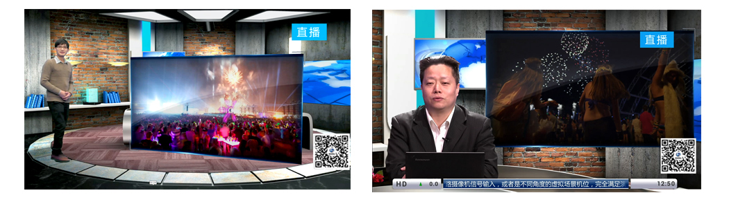 虚拟演播室系统采用无轨跟踪技术,内置色键抠像, 台设备可完成无轨跟踪、抠像、多镜头切换、图文包装等功能,虚拟演播室主要针对 些中小型节目或者行业用户,系统可支持2路摄像机信号输入,或者是不同角度的虚拟场景机位,完全满足演播室机位的切换要求,抠像效果细腻,边缘自然。