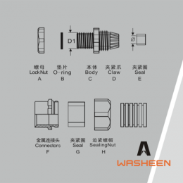 产品材质: A.C.F.H部位采用优质304不锈钢制成,B.E.G部位采用橡胶制成,D部分采用UL认可之尼龙PA66制成。