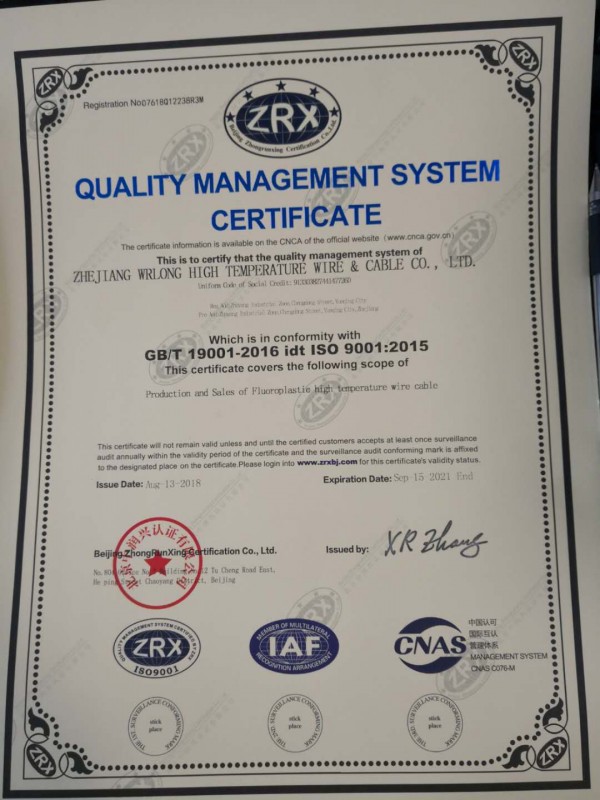 浙江威尔龙高温线缆ISO9001质量管理体系认证证书英文版
