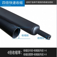 军标4:1双壁管内层是热熔胶,具有良好粘接性能,外层为柔软阻燃辐照交联聚烯烃,其收缩倍率达4倍,收缩后热溶胶能将连接两端的材料完全密封,易施工、不需保养,能耐恶劣环境、湿气等冲击,达到保护零组件作用。