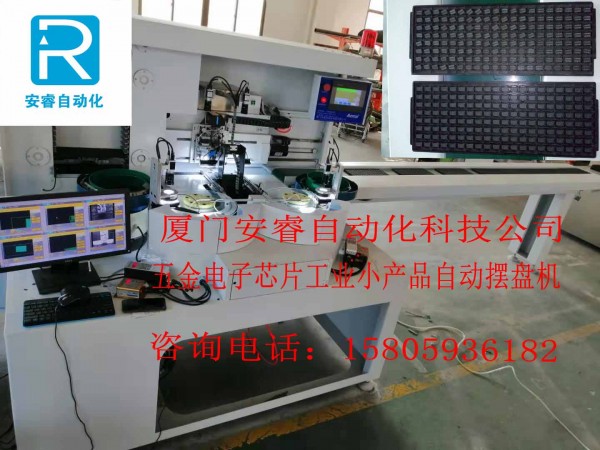 全自动摆盘机/电子类等微小产品等系列设备、我公司是专业研发设计生产、电子类产品自动摆盘机系列设备、该机主要针对电子类等微小产品需要自动摆盘/:排列: 整理等,而专业设计,为了进 步降低人工成本的提高。生产效率和产品品质的要求而设计的自动化和智能化系列设备,解决了微小产品人工操作不便,根据客户的要求来设计生产:设备原理说明、把产品的方向位置,整齐有序的排列在规定的托盘里。 个人同时可以管理3-5台机械。大大减省了人力资源。提高了工作效率,解决了效率及品质无法保证的问题。我们采用进口工控系统,性能稳定。操作简单方便, 我们可根据贵工司的特殊产品、工艺要求可开发设计生产、无限制行业,您的需求我们来实