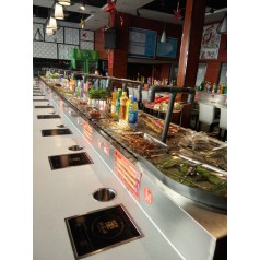 板厚度为1.2mm,内部采用白色防摩尼龙垫条,旋转吧台,寿司料理,旋转火锅,自助火锅餐厅。下架采30mm*30mm*1.5的碳钢方管焊接而成,表面经过防锈处理,