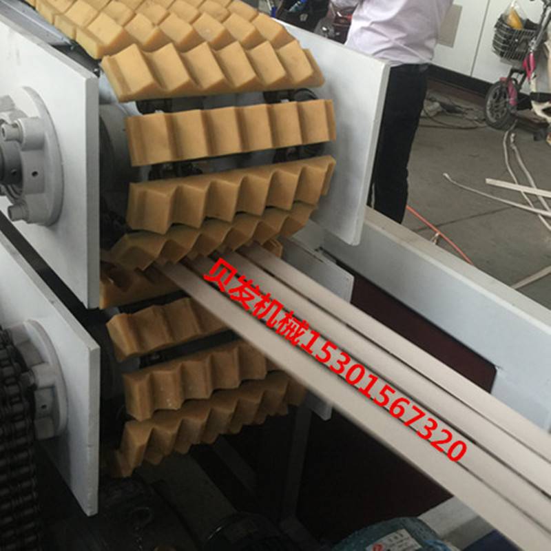 4、1.2m履带牵引机:两组独立电机驱动牵引皮带,可独立调节产品牵引速度,使操作和PVC阴阳角线成型工艺更合理稳定,提高产品合格率。