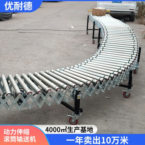 动力滚筒伸缩线是由滚筒作为输送介质,利用可伸缩的组件做机架的输送机。动力滚筒伸缩线的机体可以根据输送货物的需要自由变向,灵活改变输送方向,输送角度也可以改变。动力滚筒伸缩线的支腿高度可以调节,底部配有带刹车的脚轮可以方便移动,可按需要形成直段、S段和圆弧段等。