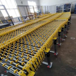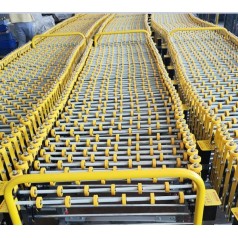 福来轮伸缩线:可自由变向,改变任意角度,支腿高度可以调节,支腿底部配有脚轮方便移动,脚轮可带刹车;承载较小,50KG左右,调高支腿高低落差, 输送物品可在重力作用下可自动向低端输送,主要用于使用频率不高的场合(封箱拆箱包装行业), 般采用直径38、48mm福来轮。