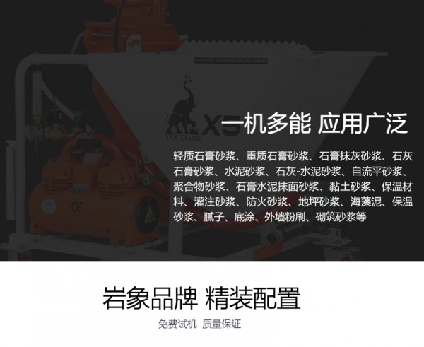 石膏砂浆喷涂机、石灰石膏砂浆喷涂机、水泥砂浆喷涂机、石灰-水泥砂浆喷涂机、自流平砂浆喷涂机、聚合物砂浆喷涂机、石膏水泥抹面砂浆喷涂机、黏土砂浆喷涂机、保温材料喷涂机、灌注砂浆喷涂机、防火砂浆喷涂机、地坪砂浆喷涂机、海藻泥喷涂机、保温砂浆喷涂机、腻子喷涂机、底涂喷涂机、外墙粉刷喷涂机、砌筑砂浆喷涂机等。