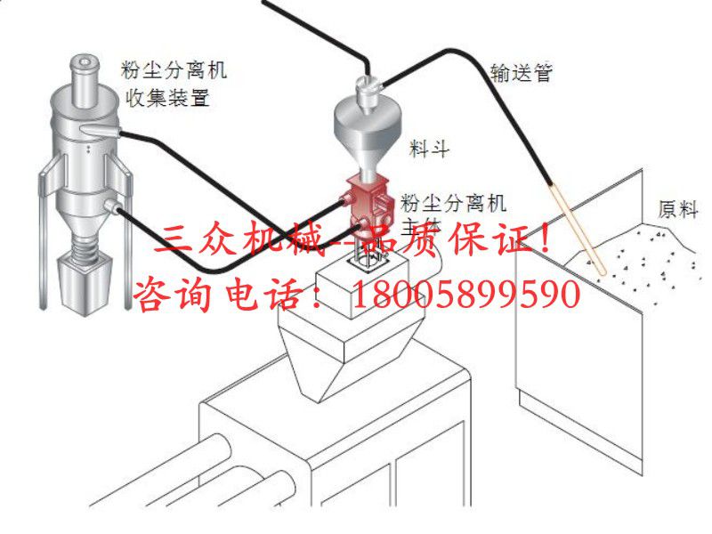 塑胶原料在输送过程中因摩擦而产生静电,使粉尘吸附在塑胶表面,粉碎回收料中也含有大量的粉尘,以上粉尘都会对塑料制品造成不良,特别是光学 与塑料透明工艺制品。CDS系列粉尘分离机配备离子静电消除器, 对塑料表面的静电进行消除,使粉尘与塑胶原料达到不吸附的状态,然后经由高压风机产生的由下而上的吹风,将轻细的粉尘吸入粉尘收集桶内,较重的塑料颗粒则往下落入储料桶内,从而达到除粉的作用。