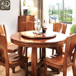 实木圆餐桌组合 胡桃木家具餐桌餐椅套装505# 胡桃木圆桌转盘 桌六椅