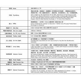 - 机器参数: 机器型号: JM-S600(全自动连续端子机) 电源电压: AC220V/50Hz 机器功能: 裁线、剥线、分线、端子压接 适用线材: SPT-2 16/3C、SPT-2 18/3C 加工速度: 2200-2400条/小时 剥线尺寸: 5mm-15mm(根据客户要求设定) 机器尺寸: 1140mm*670mm*1400mm 机器重量: 350KG
