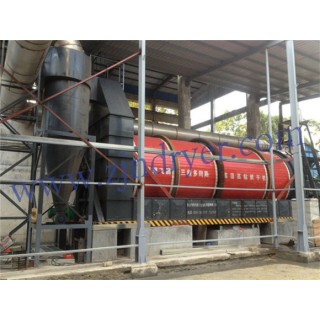低温卧式烟道气铅银渣烘干机工艺:物料由给料机经溜槽进入烘干机内导料板上,随着筒体的转动,物料被导至倾斜扬料板上即被提升到筒体的中心位置,逐渐洒落形成料幕,高温气流从中穿过,使物料预热并蒸发部分水分。当污泥洒落、移动到活动的篦条式翼板上时,物料又与预热过的篦条式翼板夹杂在 起,将热量传给物料,使部分水分蒸发。同时,翼板夹带物料提起、洒落,重复多次,物料与热气流进行对流和接触热交换。同时埋在物料中的清扫装置,也沿圆弧形扬料板的里侧下滑,把扬料板内壁粘附的物料清扫下来。当清扫装置随筒体转过垂直线以后,又在圆弧扬料板背面拖动,将其粘附在扬料板外壁的物料清扫下来。随着筒体的不断转动,使部分水分蒸发,物料得到进 步干燥。同时,清扫装置对物料团球也起到了打碎作用,提高了干燥速度, 后物料干燥后变成低水分的松散物料,由出料口排出。