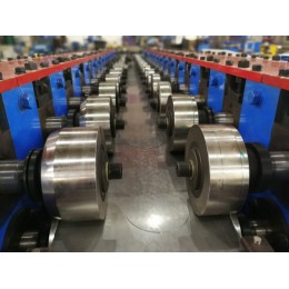 这套冷弯设备包括人工开卷机,引料装置,整平装置,冲孔,冷弯,切断,折弯,电控和出料台。