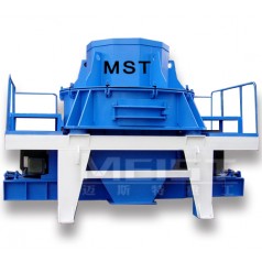 物料由进料斗进入制砂机,经分料器将物料分成两部分, 部分由分料器中间进入高速旋转的叶轮中,在叶轮内被迅速加速,其加速度可达数百倍重力加速度,然后以60-70米/秒的速度从叶轮三个均布的流道内抛射出去, 同由分料器四周自收落下的 部分物料冲击破碎,然后 起冲击到涡支腔内物料衬层上,被物料衬层反弹,斜向上冲击到涡动腔的顶部,又改变其运动方向,偏转向下运动,从叶轮流道发射出来的物料形成连续的物料幕。这样 块物料在涡动破碎腔内受到两次以至多次几率撞击、磨擦和研磨破碎作用,被破碎的物料由下部排料口排出。