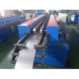 这套冷弯设备包括人工开卷机,引料装置,整平装置,冲孔,冷弯,切断,折弯,电控和出料台。