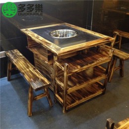 火烧石桌面实木碳烧封边火锅桌长凳定做
