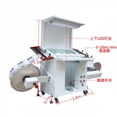 金尚达品检机适用于模切辅料卷材卷料、标签的品质检验测试小型辅助品检设备,该品检机具有复卷功能,材料收料轴的稳定控制造使收料整齐,放料及收料操作方便,品检的效率高速度快等优点。检测台面斜面符合人体正常视觉的可视角度,品检机台上部份与台内都装有照明灯源,在品检工作中更容易分辩色差,清楚地检出模切辅料、不干胶标签的产品品质情况。品检机采用电子调速,可设自动运转和脚踏开关控制转换。电子光感计张数、计长度米数,设定数值自动停机等优点。