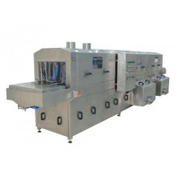 需清洗的周转筐由不锈钢链条输入清洗机中,依次通过碱水→高压热水→常温自来水→消毒水→常温风刀去水等多道工序,将筐子清洗干净,同时完成杀菌及风干;特殊筐子清洗时可在热碱水清洗段后加配毛刷,对筐子底部及左右两侧进行刷洗,提高清洗效果;采用连续式清洗,以提高清洗效率;