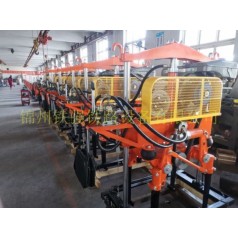 4、将走行架放在线路上,走行轮要对正两根钢轨,将升降缸提到 上端的两台捣固机依次推到放平的走架上,分别对准位置,将前后大插销插入定位孔内,再将下道架折起,把下道架上的支撑挂钩与走行架的勾环勾住。作业中,操纵司机 好面向来车方向。