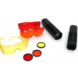 电筒2只、充电器1个、红/橙/黄眼镜各1付、红/橙/黄滤镜各1片、铝合金箱1只。