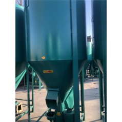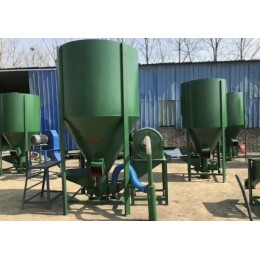 本饲料混合机为单轴,有套管,锥部卸料的立式混合机。工作时将计量好的各种粉状物料依次倒入料斗,由垂直绞龙将饲料垂直向上运送,到绞龙端部由拨料板将饲料抛扬向筒体内壁,物料与筒壁受 次撞击后反弹和散落在桶内。这样循环多次进行混合。