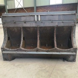 大三孔水泥料槽模具外型尺寸:900*730*430,是用的 多的 种。用加厚型钢板制作而成,重约80KG,成品水泥料槽可达342斤重,
