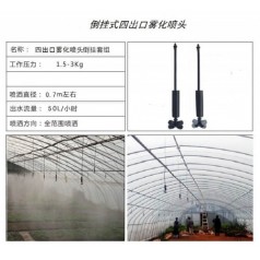 性能特点:喷头完全引进以色列技术,设计采用 种涡流喷嘴,提供涡流喷雾流,降低堵塞的可能性。雾化效果良好,配合防滴器,有效杜 停喷后的滴漏伤苗现象;分解式构造,便于维修,可使用四出口或单出口喷头。主要用途:倒置安装时于适当位置,用于温室大棚中扦插育苗,以及温度控制。工程造价相对较低。用于温室或家禽饲养场的温度控制。四出口雾化喷头技术参数 流 量 35L/h 射 程 0.7m 适用水压 0.21Mpa ~ 0.4Mpa 四出口雾化喷头采用以色列技术,雾化效果好,配合防滴器,能有效杜 停喷后滴漏伤苗现象,广泛应用于温室大棚内增湿降温和家禽饲养场的温度控制. ◆ 整套采用4个喷嘴和+字联接,使得雾粒的分布更均匀。 ◆ 高效防滴阀设计,能做到真正停喷止滴,避免滴水伤苗。 ◆ 开阀压力有高压(4.0bar)和低压(2.5bar)两种。 ◆ 25微米左右的雾粒而无需超高压力,流量40L/h 。 ◆ 是高档鲜切花温室、养殖场等加湿降温的理想产品。 ◆ 建议使用150目或150目以上的过滤器