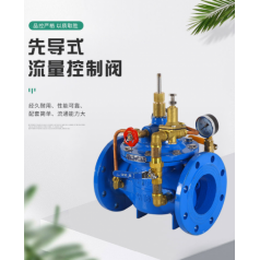 400X流量控制阀是 种采用高精度 导式方式控制流量的多功能阀门。适用于配水管需控制流量和压力的管道中,保持预定流量不变,将过大流量限制在 个预定直,并将上游高压适当减低,即使主阀上游的压力发生变化,也不会影响主阀下游的流量。400X流量控制阀 改常规节流阀使用孔板或纯机械地减小流域面积的原理,利用相关导阀, 大限度地减少能力在节流过程中的损失。如遇紧急情况400X控制阀可以完全截止流量,避免损失。控制灵免度高,安全可靠,调试简便,使用寿命长