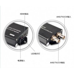 AHD/TVI/CVI转HDMI专业三合 高清转换器,采用自主研发工业 SCALER芯片(CH5600)转换处理设计,将 路AHD/TVI/CVI信号转换为 路HDMI信号输出,同时支持 路AHD/TVI/CVI信号放大环出。使您的HDMI高清显示设备兼容AHD/TVI/CVI系统。AHD信号自动识别兼容AHD-720P、AHD-960P、AHD-1080P/TVI信号自动识别兼容TVI-720P、TVI-960P、TVI-1080P/CVI -720P、CVI-1080P等模拟高清信号,HDMI输出信号为:1080P50或者1080P60.工控 电源设计支持DC5V-20V宽电压输入,更长使用寿命。