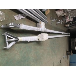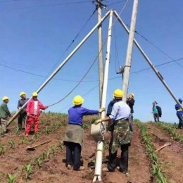 用铝合金三角架立杆机主杆上配带的销钉,把主杆(长杆)、两副杆的头部进行连接。 2、把三杆成三角形状平放在地面上。提示:三杆头部连接处应位于杆坑处。 3、三名施工人员,各自握住 根杆体,用力上推把该机立起。提示:在上推时为了不使杆体左右偏移,应保持三根杆的跟部不离开地面,三杆上推时推升距离应相等。例:主杆上推1米两副杆也应同步上推1米。 4、三角架铝合金立杆机立起后应保证三杆头部连接处与线杆坑底部垂直。 5、把将要立起的线杆运至适当位置,详细见下图表。 铝合金立杆机的型号:三角架立杆机,人字立杆机和铝合金框式立杆等 本厂作为 专业的电力施工工具铝合金立杆机的制造商,主要生产的产品有,铝合金立杆机,机动绞磨,防扭牵引钢丝绳,放线滑车,电缆放线架,电缆拖车,电缆滑车,手扶拖拉机绞磨,玻璃钢穿孔器,起重滑车,机械打孔机,铝合金人字抱杆、电缆剪刀、液压压接钳、电缆剥皮器电力施工工具。 铝合金立杆机主要材质为铝镁合金铝合金管材,质量轻,承重能力强,搬运方便,操作简单,深受广大电力施工单位的好评。 铝合金立杆机由三根杆组成,所以又被称为三脚立杆机或三脚架立杆机。 铝合金立杆机可组立的线杆长度为:8米线杆用立杆机,10米线杆立杆机,12米线杆立杆机,15米线杆立杆机。 铝合金立杆机用途:用于输配电线路施工中整体起立小型单杆或起吊 般重量的部件。说明:手摇绞磨输出力为5kN;立杆机安全系数2.5。 铝合金立杆机特点:1、杆体采用国标铝合金管,重量轻,承载能力强。2、组装、拆卸方便,利用采用三角型稳定性,不用打地锚,即可轻松立杆。3、采用快、慢双速手摇绞磨,结合双滑轮组,单人摇动绞磨即可完成立杆工作。 铝合金立杆机特点: 1、立杆机杆体采用国标铝合金管,重量轻,承载能力强。 2、铝合金立杆机组装、拆卸方便,利用三角型稳定性,不用打地锚,即可轻松立杆。 3、立杆机采用快、慢双速手摇绞磨,结合双滑轮组,单人即可完成立杆工作