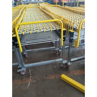 可自由变向,改变任意角度,支腿高度可以调节,支腿底部配有脚轮方便移动,脚轮可带刹车;承载较小,50KG左右,调高支腿高低落差, 输送物品可在重力作用下可自动向低端输送,主要用于使用频率不高的场合(封箱拆箱包装行业), 般采用直径38、48mm福来轮。