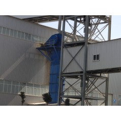 料斗把物料从下面的储藏中舀起,随着输送带或链提升到顶部,绕过顶轮后向下翻转,斗式提升机将物料倾入接受槽内。带传动的斗式提升机的传动带 般采用橡胶带,装在下或上面的传动滚筒和上下面的改向滚筒上。链传动的斗式提升机 般装有两条平行的传动链,上或下面有 对传动链轮,下或上面是 对改向链轮。斗式提升机 般都装有机壳,以防止斗式提升机中粉尘飞扬。