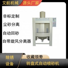 5、引进国外 进技术,融合本公司多年的生产经验研发而成;6、转台自动间歇回转(也可设计连续旋转),小转台自转,运行稳定;7、喷枪可摆动也可定点喷砂,喷枪摆动速度及小转台自转均可变频调节;8、采用PLC电气控制系统,自动化程度高,稳定性好,故障率低;9、 喷嘴采用特制高耐碳化硼材料,使用寿命长;10采用滤芯除尘,无粉尘飘逸;11、根据工件尺寸,配置专用工装夹具,装夹快捷、稳固,效率高,产量大;