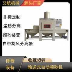 自动喷砂机为密闭内循环舱式喷砂机,采用变频调速输送带,配置专业的旋风分离器,可实现磨料与粉尘的有效分离,保证产品加工的高质高效,同时限度节省磨料的消耗。独立的抽风除尘系统,能有效地清理室体散布的粉尘,防止粉尘污染。