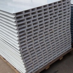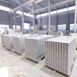 中空玻镁彩钢夹芯板以二层5mm防火玻镁板、中间加防火玻镁内隔条为芯材 ,经彩钢夹芯板多功能连续生产线复合成型,中空玻镁彩钢夹芯板其特点板材 为防火不燃材料组成,提高了彩钢夹芯板的防火性能,又能满足在有防潮 湿环境条件下使用。其芯材为中空板材,中空玻镁板的轻质,防火的特性,适用于隔墙、临时性的房屋墙面、钢结构房屋等,具有施工简单,节省成本的特点。且用于车间隔墙在电气施工铺设暗线时较为方便,该产品投入生产后被广泛使用于净化车间无尘室的吊顶及隔墙
