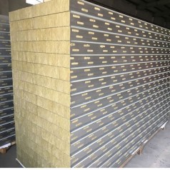 2.岩棉芯材:采用密度为80kg/m3-120kg;岩棉块交错铺设,其纤维走向垂直于夹芯板的上、下表面,并紧密相接充实了夹芯板的整个纵横面。岩棉块之间和岩棉与上、下层钢板之间通过发泡剂粘接而形成整体,生产工艺保证了高密度的岩棉隔热体与金属板内壁之间能产生强的粘着力,从而使岩棉夹芯板具有好的刚度。