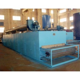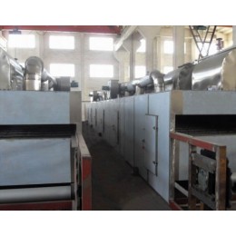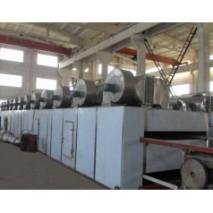 物料由加料器均匀地铺在网带上,网带 般采用12-60目不锈钢丝网,由传动装置拖动在干燥机内移动。干燥机由若干单元组成,每 单元热风独立循环,部分尾气由专门排湿风机排出,废气由调节阀控制,热气由下往上或由上往下穿过铺满物料的网带完成热量与质量传递的进程,带走物料水份。网带缓慢移动,运行速度可根据物料温度自由调节,干燥后的成品连续落入收料器中。上下循环单元根据用户需要可灵活配备,单元数量亦可根据需要选取。