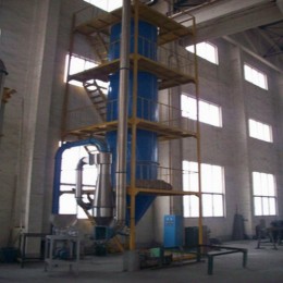 本机工作原理是空气通过滤清器进入加热器,交换成热空气,进去干燥室顶部的热空气分配器,使空气均匀呈旋转状或平行轴线进入干燥室。料液需经过筛后由高压泵送至设在干燥室顶中心的喷嘴,将料液均匀的雾化,使液滴的表面积大大增加,与热空气相遇接触,使水份迅速蒸发,在 短的时间里干燥成为颗粒产品,大部分产品由设在塔底部出料口收集,废气和微小粉粒经旋风分离器分离,成品由旋风分离器下端收集筒收集,废气由抽风机排出。