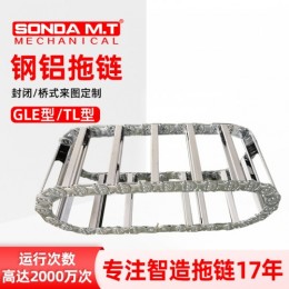 钢制拖链的主体是由链扳(钢板镀铬)支撑扳(挤拉铝合金)轴销(合金钢)等部件组成,使电缆或橡胶管与拖链之间不产生相对运动,不产生扭曲变形,链扳经镀铬处理外形效果新颖结构合理,灵巧强度高,钢性好不变形,安装方便,使用可靠,易拆装,尤其是采用高强度耐磨材料,合金铜为轴销,提高了产品的耐磨强度,弯曲更灵活,阻力更小,降低了噪音,从而可保证长时间使用不变形,不下垂。